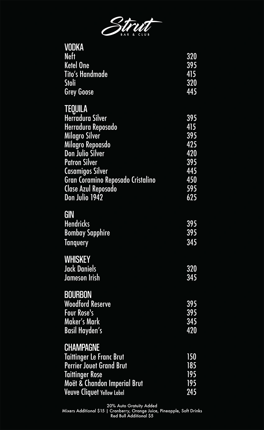 Two Drink Minimum Per Guest. All items are subject to availability. 20% Auto gratuity is added to every check.